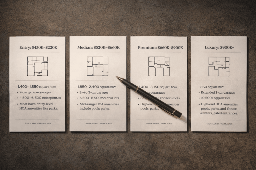 Gilbert’s inventory segments clearly by price tier, and each tier produces a different physical product. Ranges below use the ARMLS/FlexMLS 2025 price-per-square-foot band ($269–$280) and represent typical single-family inventory patterns.