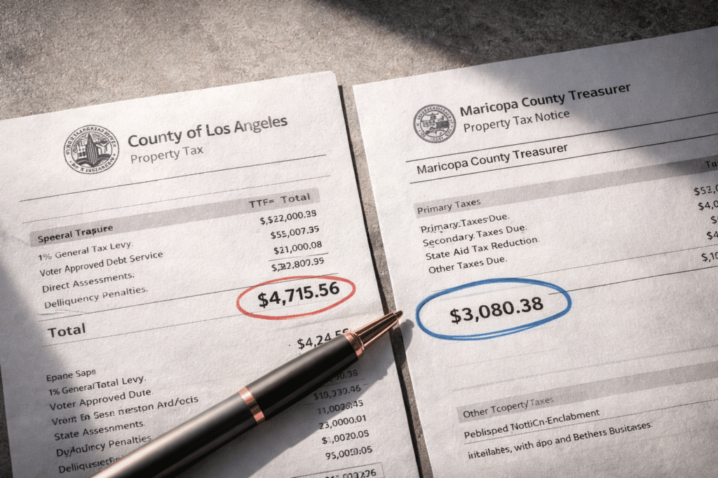 Sources: Tax Foundation 2025; Maricopa County Treasurer; California FTB; LA County Assessor. Estimates assume assessment at purchase price and typical effective-rate ranges.