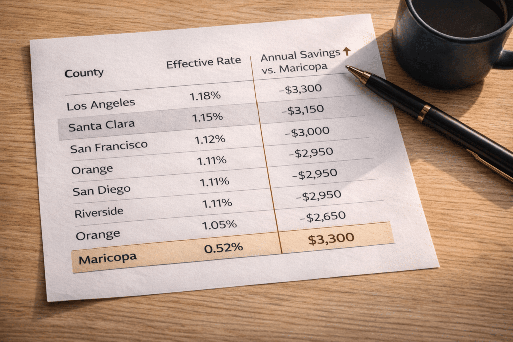 Sources: Abode Money 2025 California County Property Tax Trends (effective rates); Maricopa County Treasurer (effective rate references). Figures are estimates. Parcel-level tax bills vary by special districts, exemptions, and jurisdiction.