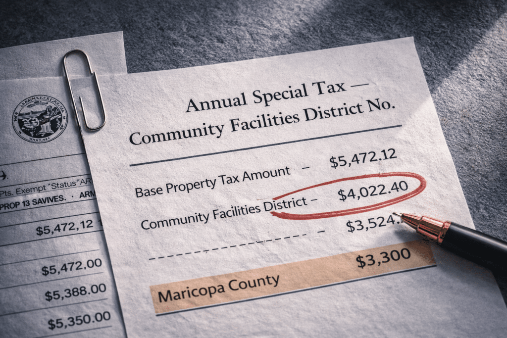 Arizona does not have a direct Mello-Roos equivalent in name. Special districts exist in Maricopa County and can add to totals, but the magnitude and frequency differ from California’s CFD pattern. The correct comparison for a seller already paying Mello-Roos is their actual total annual bill, not the 1% base rate.