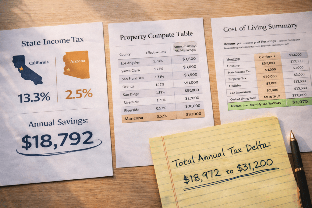Property tax is meaningful — but for many households, state income tax is the larger annual lever. Arizona’s flat 2.5% rate versus California’s top marginal 13.3% (plus surcharge structure) can produce $15,000–$25,000+ in annual income tax savings for households earning $200,000–$300,000. The property tax savings documented here (often $2,600–$6,600/year depending on county and price) are additive.