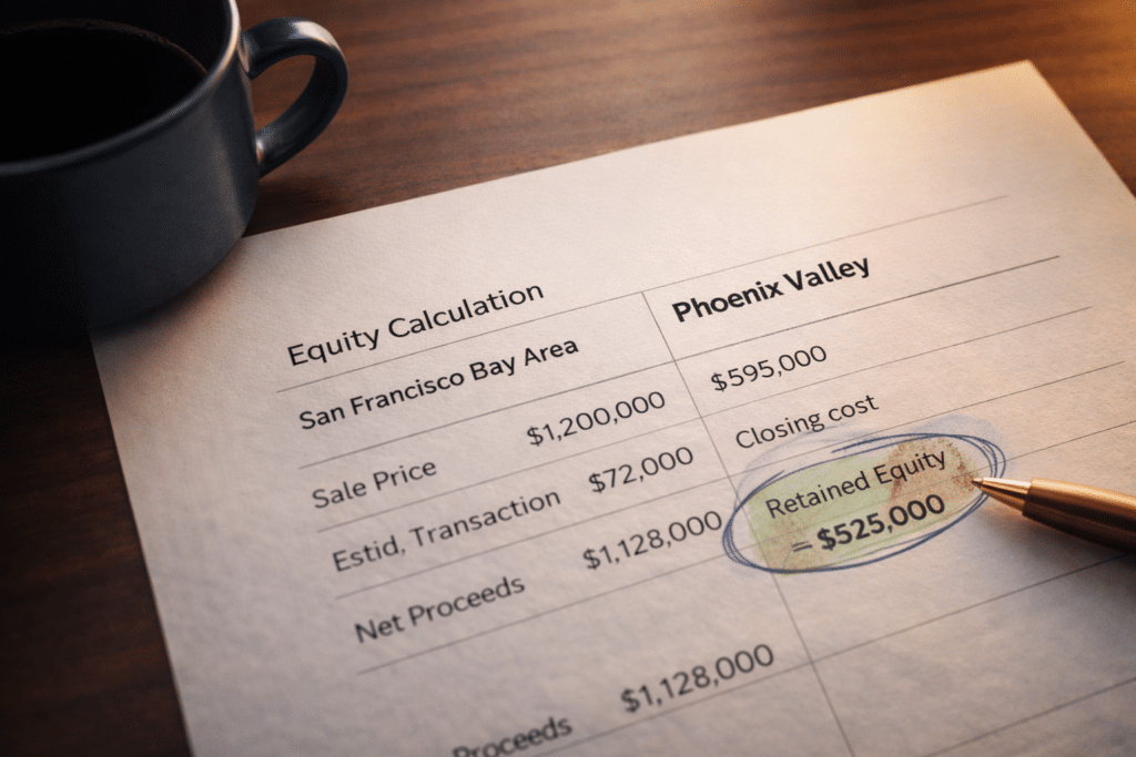 Price data: ARMLS, Phoenix REALTORS year-to-date 2025 reports. Equity retained estimates assume 6% transaction costs on Bay Area sale and standard Phoenix closing costs. Individual results vary based on actual sale price, loan payoff, and closing terms.