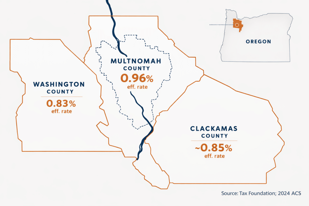 The Portland metropolitan area spans three primary counties — Multnomah, Washington, and Clackamas — each with its own effective property tax rate for owner-occupied housing. The rates vary because each county carries a different combination of permanent levy rates, local option levies, bond measures, and urban renewal special levies. The rates below represent county-level effective rates applied to real market value, based on the 2024 American Community Survey.