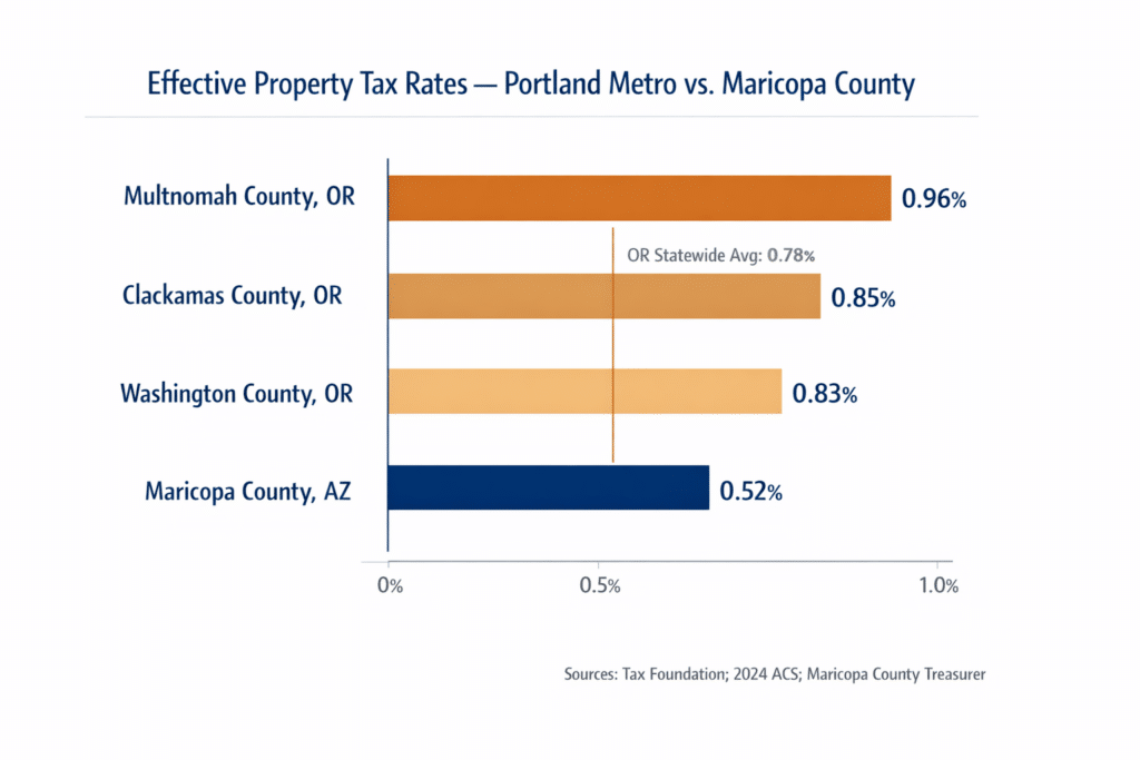 SOURCE: Tax Foundation Oregon rate (0.96% Multnomah); Maricopa County Treasurer (0.52%); RMLS Q1 2025 Portland metro median (~$537,000)