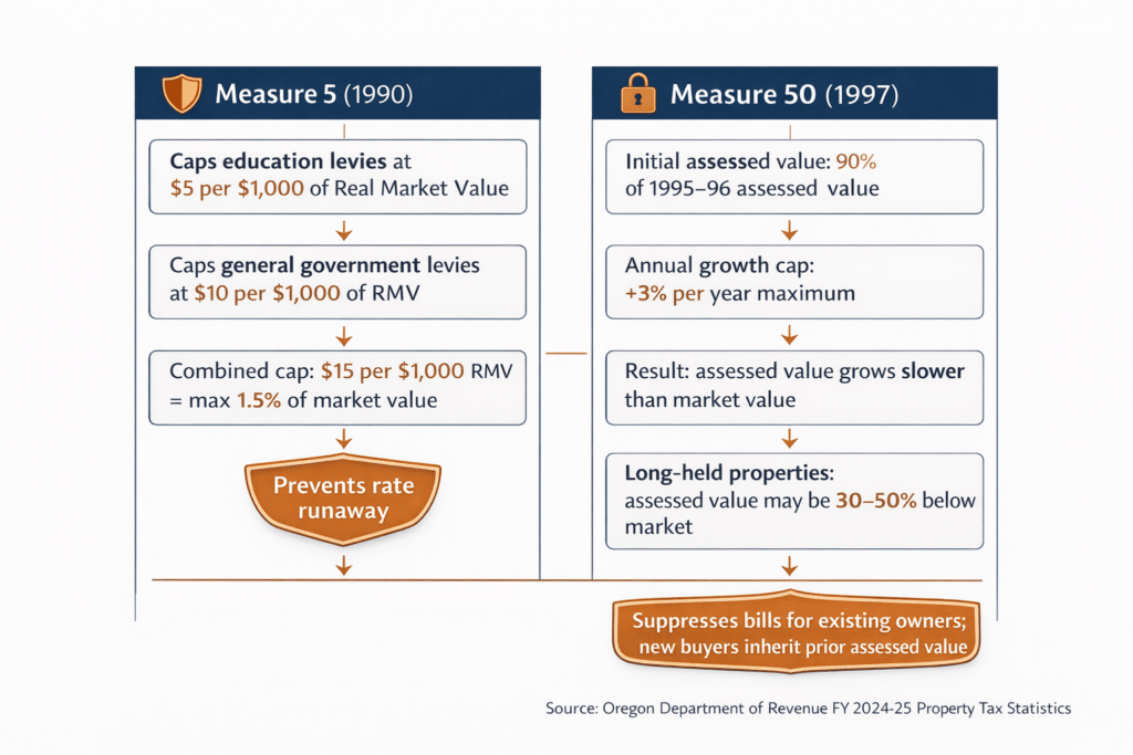 Oregon’s property tax structure is governed by two voter-approved ballot measures that fundamentally changed how property is assessed and how rates are capped. Understanding these mechanisms matters for Portland homeowners who are evaluating what their property tax bill has been versus what a new buyer in Portland would pay — and how both compare to Arizona’s structure.