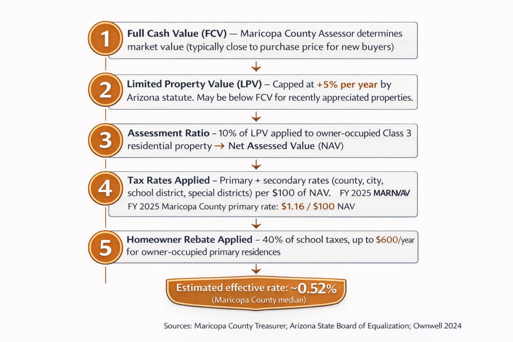 In practice: Maricopa County new buyers typically receive a Notice of Value in late January or early February of the year following purchase, reflecting the new valuation. The first full-year tax bill is usually based on a LPV that is 80%–100% of the purchase price, subject to the 5% annual cap on LPV increases. The Homeowner Rebate (40% of school taxes, up to $600) applies from the first year if the property is the owner’s primary residence.