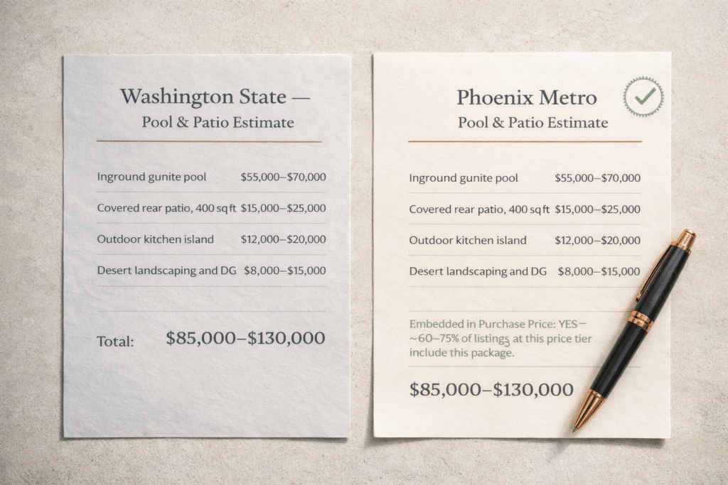 In the Phoenix Valley, a pool is not a luxury add-on that a buyer negotiates separately. It is a standard infrastructure feature embedded in the majority of homes in the $500,000 to $700,000 price range — appearing in approximately 60% to 75% of single-family listings in primary East and West Valley markets at that price tier, according to Phoenix REALTORS market data. When a King County seller purchases a Phoenix Valley home that includes an existing inground pool, covered rear patio, and professionally landscaped desert yard, they are not paying extra for those features. They are acquiring them as part of the purchase price — embedded capital that would cost $75,000 to $110,000 or more to build from scratch.